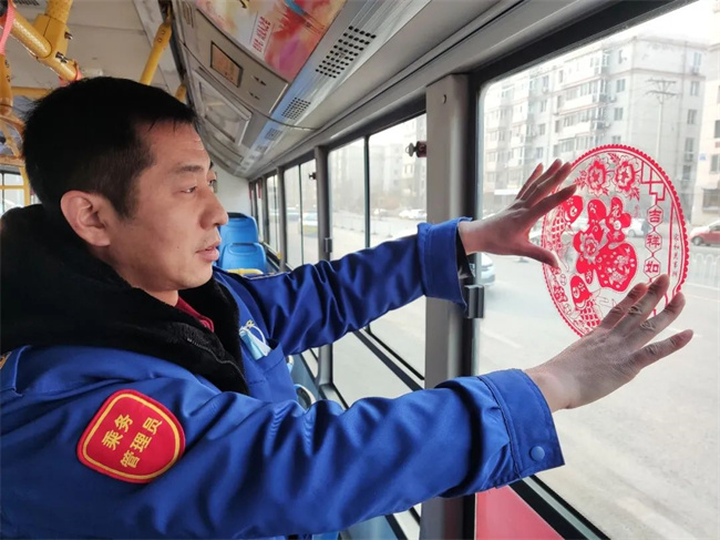 大年三十,堅守崗位的駕駛員給公交車窗貼上“?!弊?,布置節(jié)日飾品,讓節(jié)日期間乘坐公交車出行的市民感受到新春的氣氛。