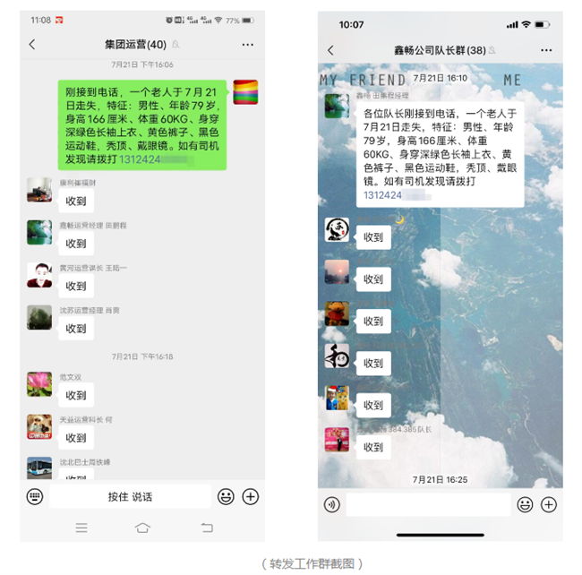 7月21日,沈陽(yáng)客運(yùn)集團(tuán)運(yùn)營(yíng)部接到市民求助電話,請(qǐng)求幫忙尋找一名走失的老人。運(yùn)營(yíng)部立即將求助信息發(fā)送至各運(yùn)營(yíng)單位,由各運(yùn)營(yíng)單位轉(zhuǎn)發(fā)至各線路隊(duì)長(zhǎng),再由各隊(duì)長(zhǎng)轉(zhuǎn)發(fā)至各車隊(duì)微信工作群。