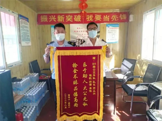 8月25日下午,市民薛英山懷著感激的心情給211、222路車隊送來了一面錦旗,上面寫著“助人為樂大公無私 拾金不昧品德高尚”的字樣,他以這樣的方式表達著對211、222路車隊和駕駛員溫偉的感謝之意。