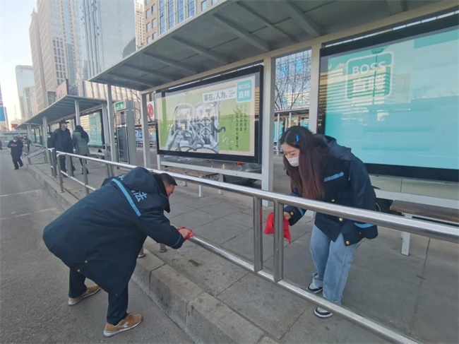 活動中,志愿者們?yōu)閬硗每椭敢较?,送上熱飲,并拿起掃把、鐵鍬等工具對垃圾、落葉等進(jìn)行清掃、分裝、清運,對公交護(hù)欄、電子站牌等衛(wèi)生死角進(jìn)行全面清理,使樞紐站內(nèi)環(huán)境衛(wèi)生煥然一新。