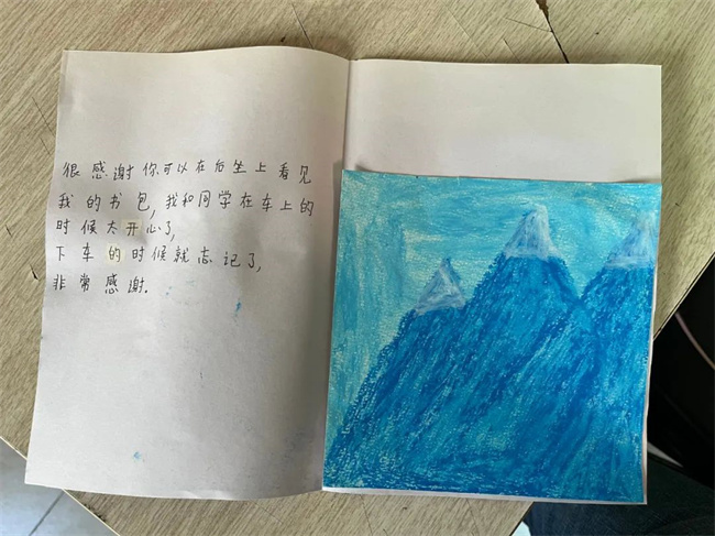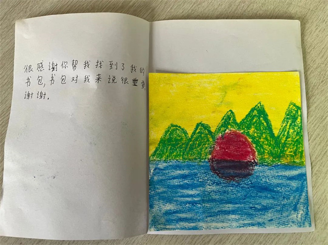 打開這封信,是一封由小朋友自己親手制作的感謝信,信中寫道:“很感謝你在后座上看見我的書包,我和我的同學(xué)在車上的時候太開心了,下車時就忘記了,非常感謝?!薄昂芨兄x你幫我找到了我的書包,書包對我來說很重要,謝謝。”