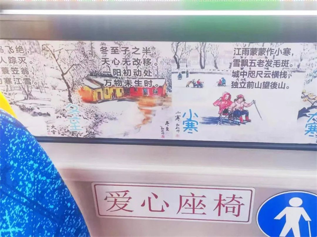 據(jù)方堃介紹,除了給乘客提供座墊套的服務(wù)外,她還通過上網(wǎng)搜集24節(jié)氣常識和詩句,在車廂內(nèi)的座位附近張貼了24節(jié)氣的相關(guān)詩句,方便乘客了解民風(fēng)民俗,弘揚傳統(tǒng)文化,這些常識類的詩句很受一些帶孩子乘車的家長和孩子們的歡迎。