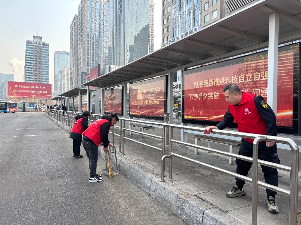 在北站公交樞紐站,志愿者們認(rèn)真清掃公交樞紐站內(nèi)的垃圾、擦拭公交候車?yán)纫约芭抨?duì)護(hù)欄,不放過(guò)任何一個(gè)衛(wèi)生死角,為乘客們營(yíng)造了一個(gè)整潔舒適的候車環(huán)境。