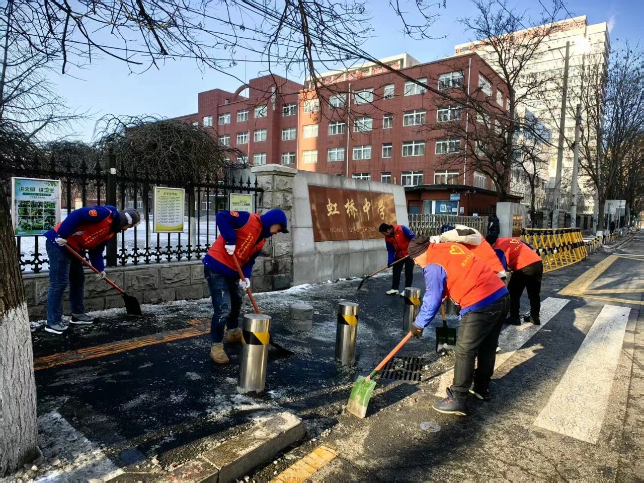 活動(dòng)當(dāng)天,黨員志愿者們身著紅色馬甲,準(zhǔn)時(shí)集結(jié),參與淮北社區(qū)組織的清冰除雪志愿服務(wù)活動(dòng)。針對(duì)虹橋中學(xué)校門口人行橫道積雪結(jié)冰、易滑難行的問題,志愿者們重點(diǎn)對(duì)該區(qū)域展開集中清理。大家手持鐵鍬、雪鏟、掃帚等工具,分工協(xié)作、齊心協(xié)力,將路面積雪與薄冰徹底鏟除清運(yùn)。經(jīng)過一番努力,校門口人行橫道恢復(fù)干凈通暢,通行條件顯著改善,為師生的安全出行提供了堅(jiān)實(shí)保障。