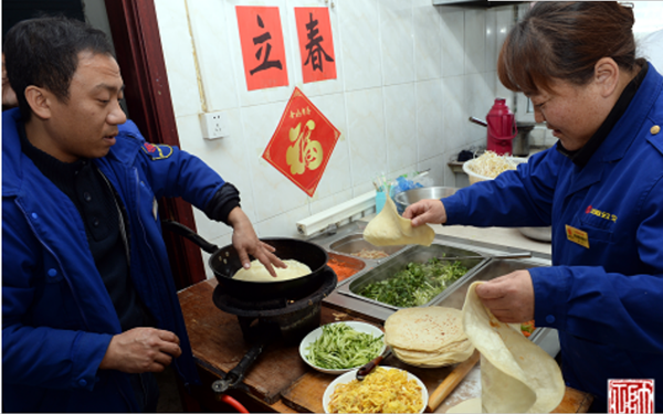 車隊齊隊長告訴記者,去年冬運開始后,沈陽各條公交線路終點站食堂為一線職工提供免費早午餐,保證駕駛員吃飽喝足再開工。“往常,早餐做花卷、雞蛋、粥等早點,午餐是兩素一葷,保證駕駛員營養(yǎng)充足。”齊隊長說,初七當(dāng)天是節(jié)后第一個工作日,2條線路60名駕駛員全部到崗。當(dāng)天恰逢“立春”,立春是二十四節(jié)氣之首,是民間最為重視的一個節(jié)氣,這一天素有吃春餅、鞭春牛等習(xí)俗。車隊條件簡單,但為了讓大家伙感受春的氣息,讓司機一起“咬春”,車隊工作人員初六那天就采購好卷餅菜所需的食材,當(dāng)天一大早就來到站房和面、烙餅。記者注意到,吃完春餅,齊隊長還給每人發(fā)了一個“平安果”,寓意新的一年平平安安。